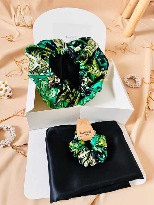 Taie d'oreiller en Satin Noir - Bonnet en satin - Chouchou - Assorti -Box cadeau Femme