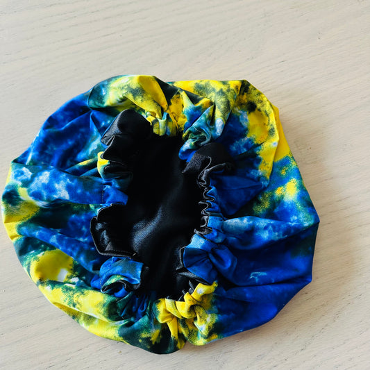 Bonnet en Satin - Verso Tie & Dye - Bleu et Jaune