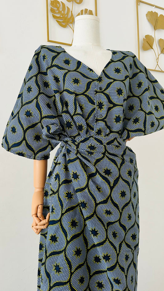 Ensemble kimono et jupe taille haute - En wax - Bleu et jaune