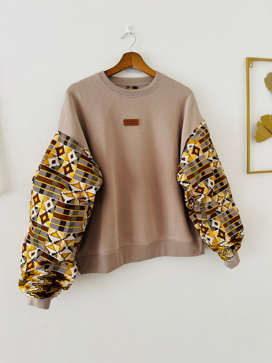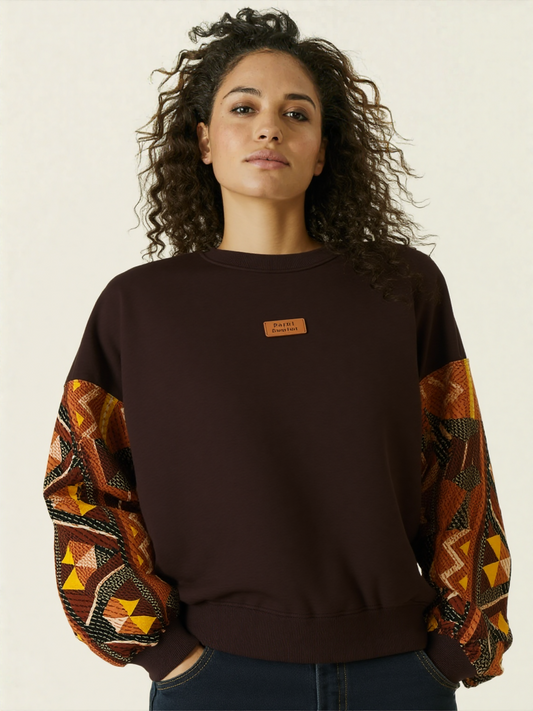 Sweat femme marron - Manches batik Bogolan pailleté