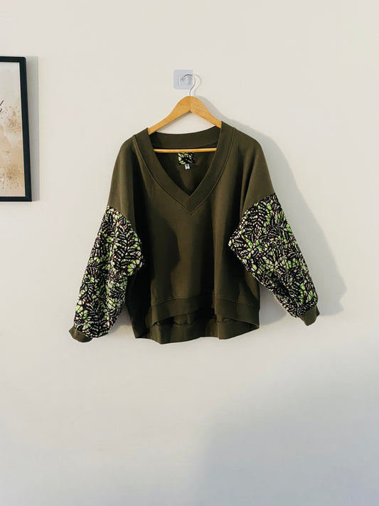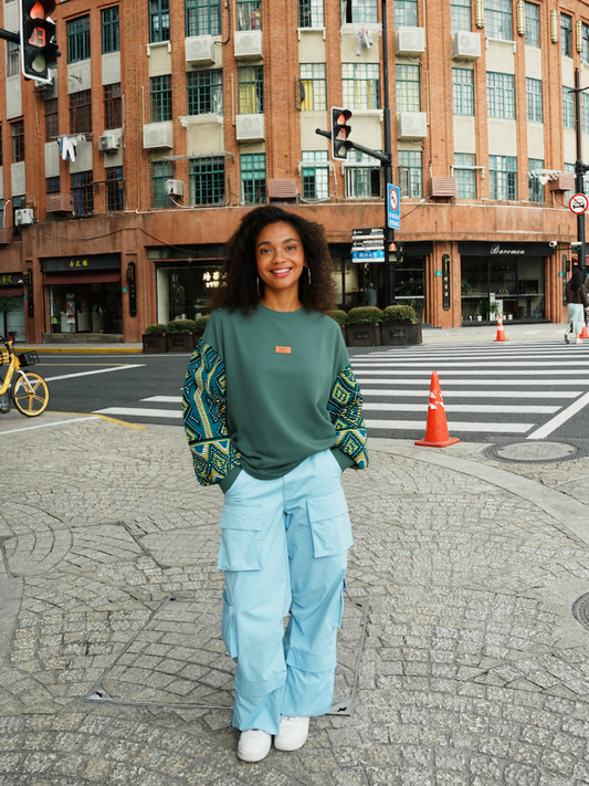 Sweat femme vert manches batik Bogolan pailleté
