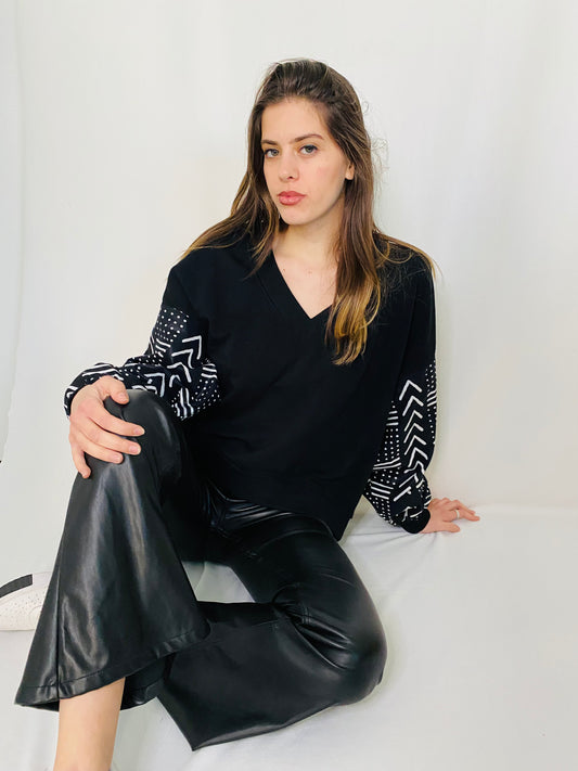 Hoodie wax femme - sweat col V - manches tissu wax - kente noir et blanc - sweat wax