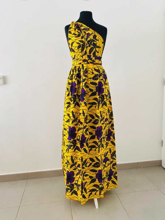 Ensemble kimono et jupe taille haute - En wax - Bleu et jaune