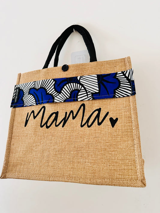 Sac cabas toile de jute Personnalisé "MAMA" Wax bleu