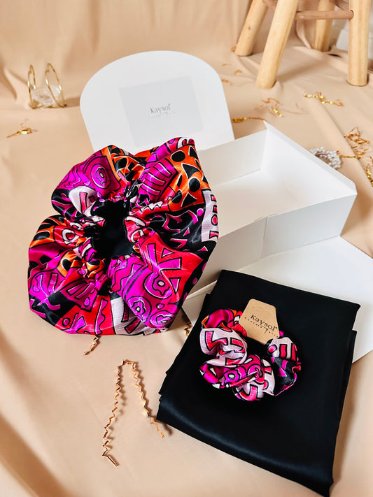 Box Cadeau Girly - Bonnet en satin imprimé rose - Taie - chouchou Assorti