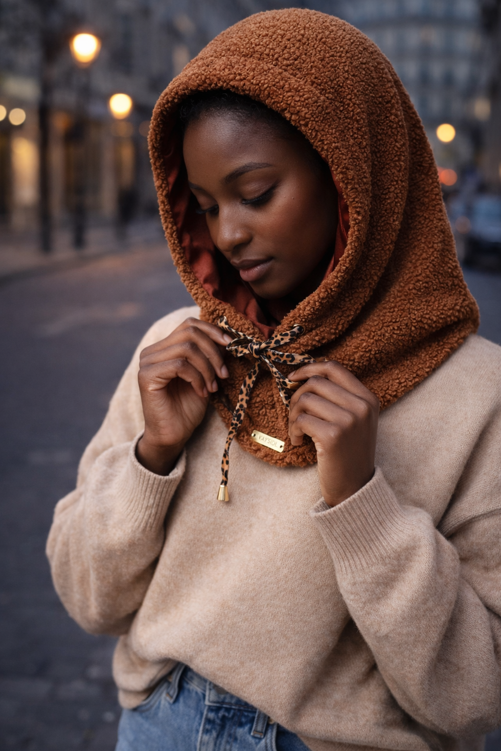 Les liens de serrage motif léopard, finis par des embouts dorés, permettent d’ajuster la cagoule selon le style souhaité.