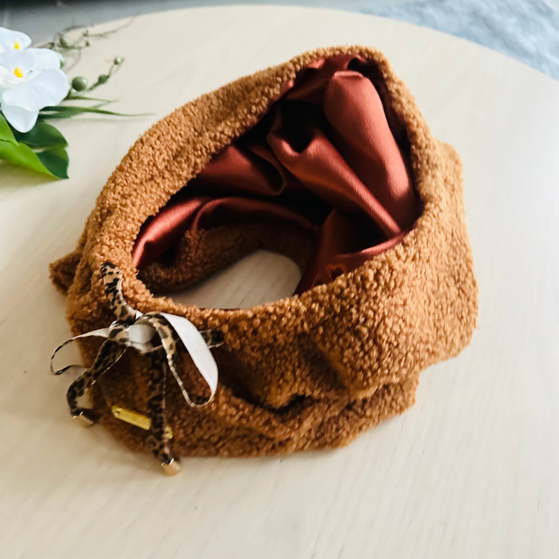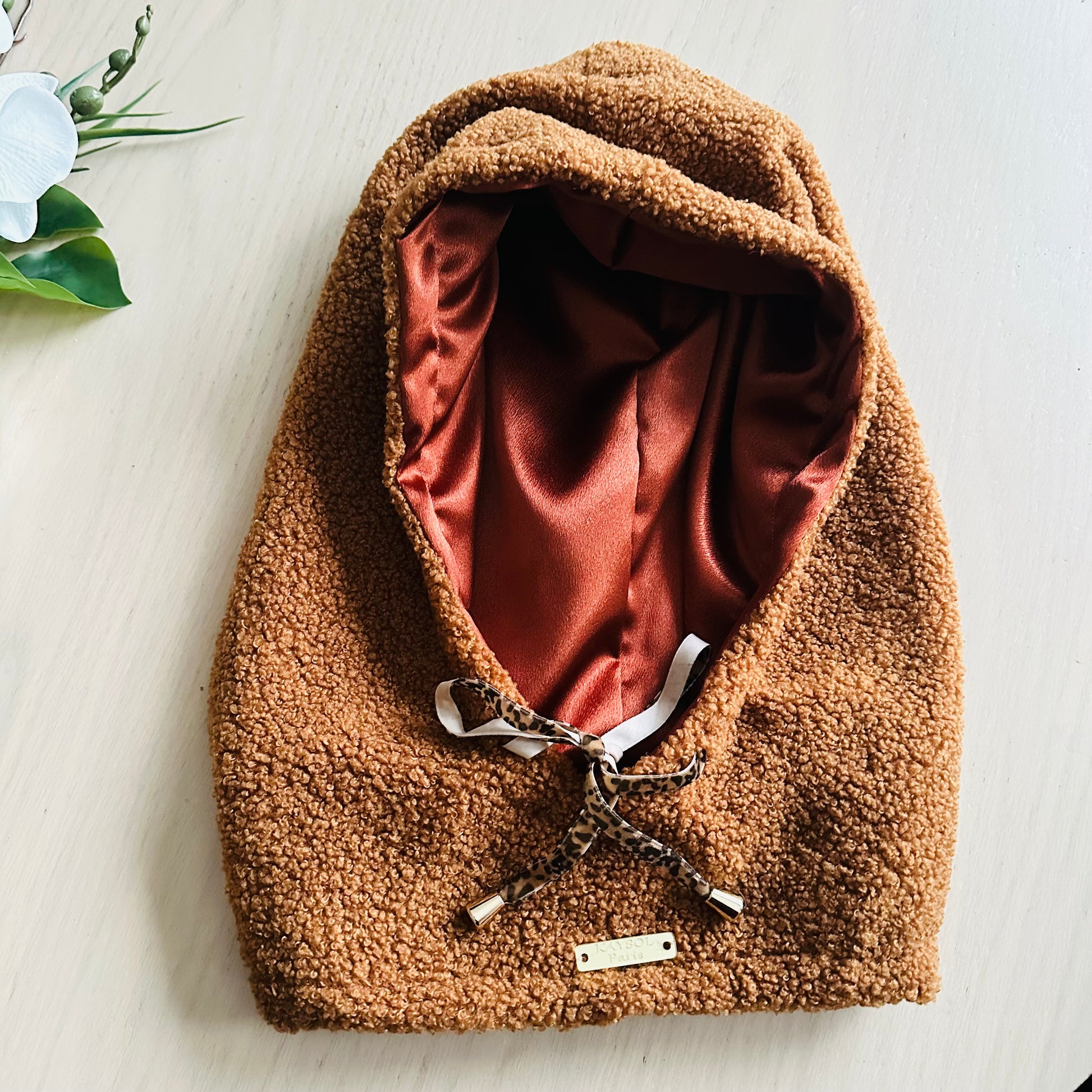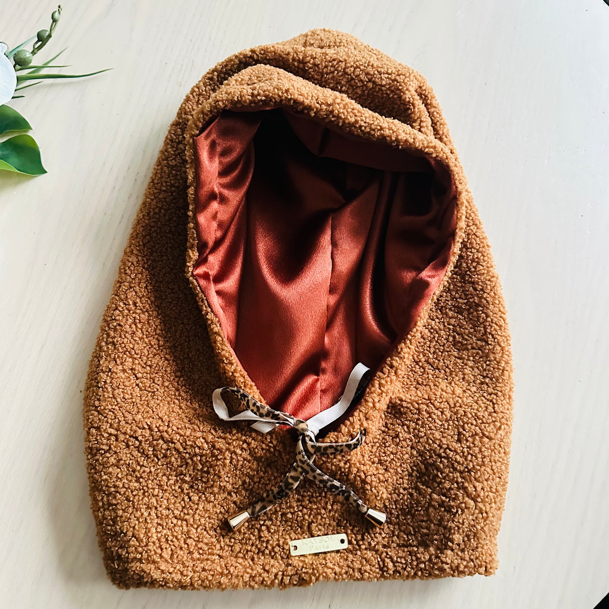 L’extérieur en fausse fourrure douce apporte chaleur et style, tandis que l’intérieur est entièrement doublé en satin lisse, conçu pour protéger les cheveux et éviter les frottements.