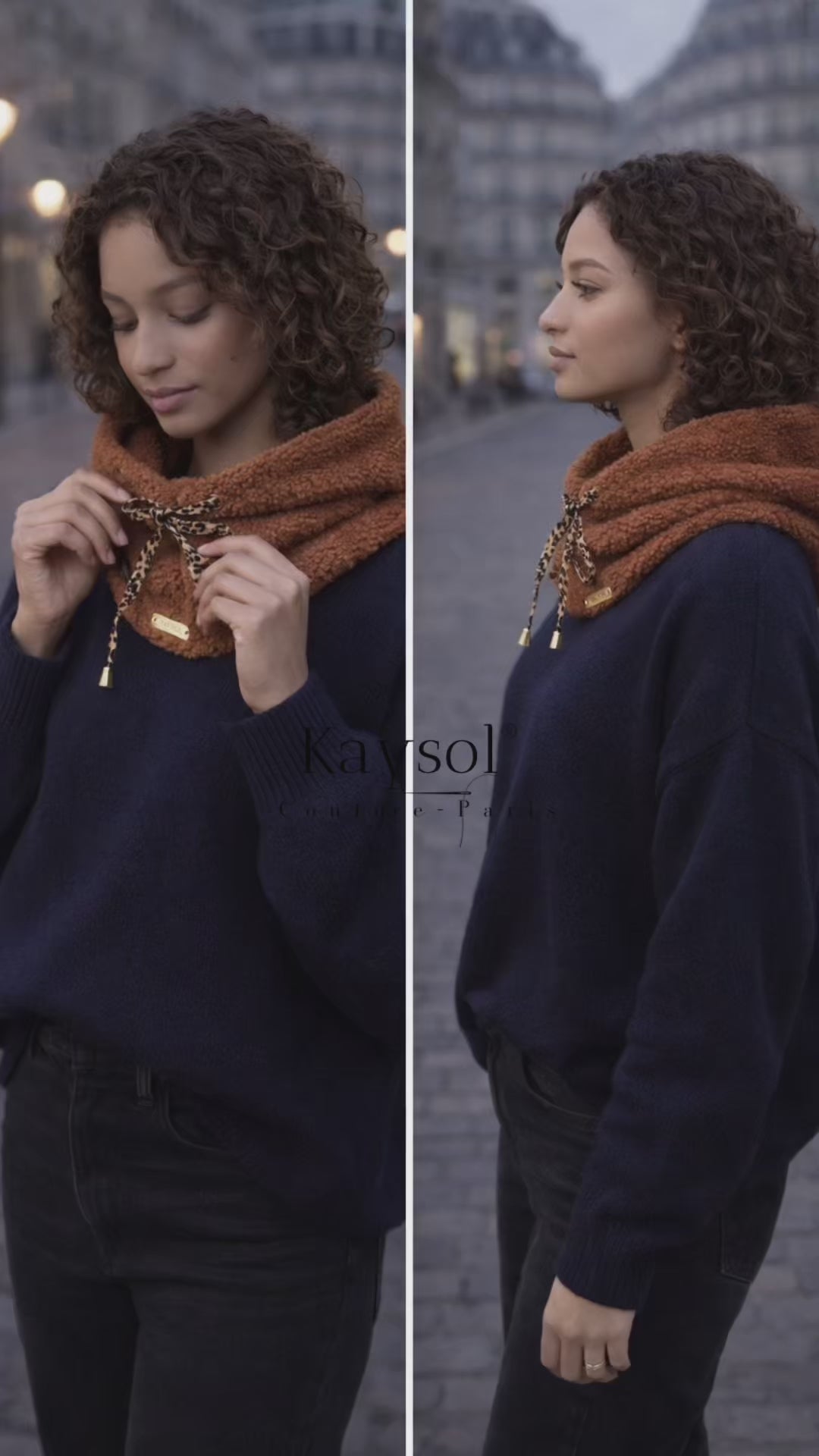 La cagoule Kaysol est pensée comme une pièce hybride et élégante, à mi-chemin entre la capuche et le cache-cou.