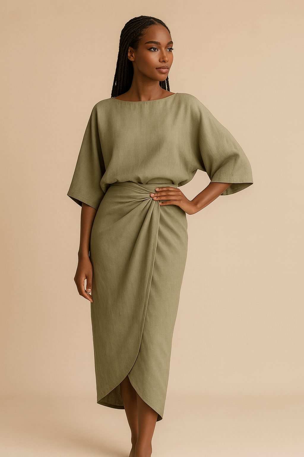 Ensemble, en 100 % lin, matière durable et uxueuse d’une haute qualité, découvrez nos ensemble en Lin pour femmes haut ample et jupe portefeuille longue minimaliste