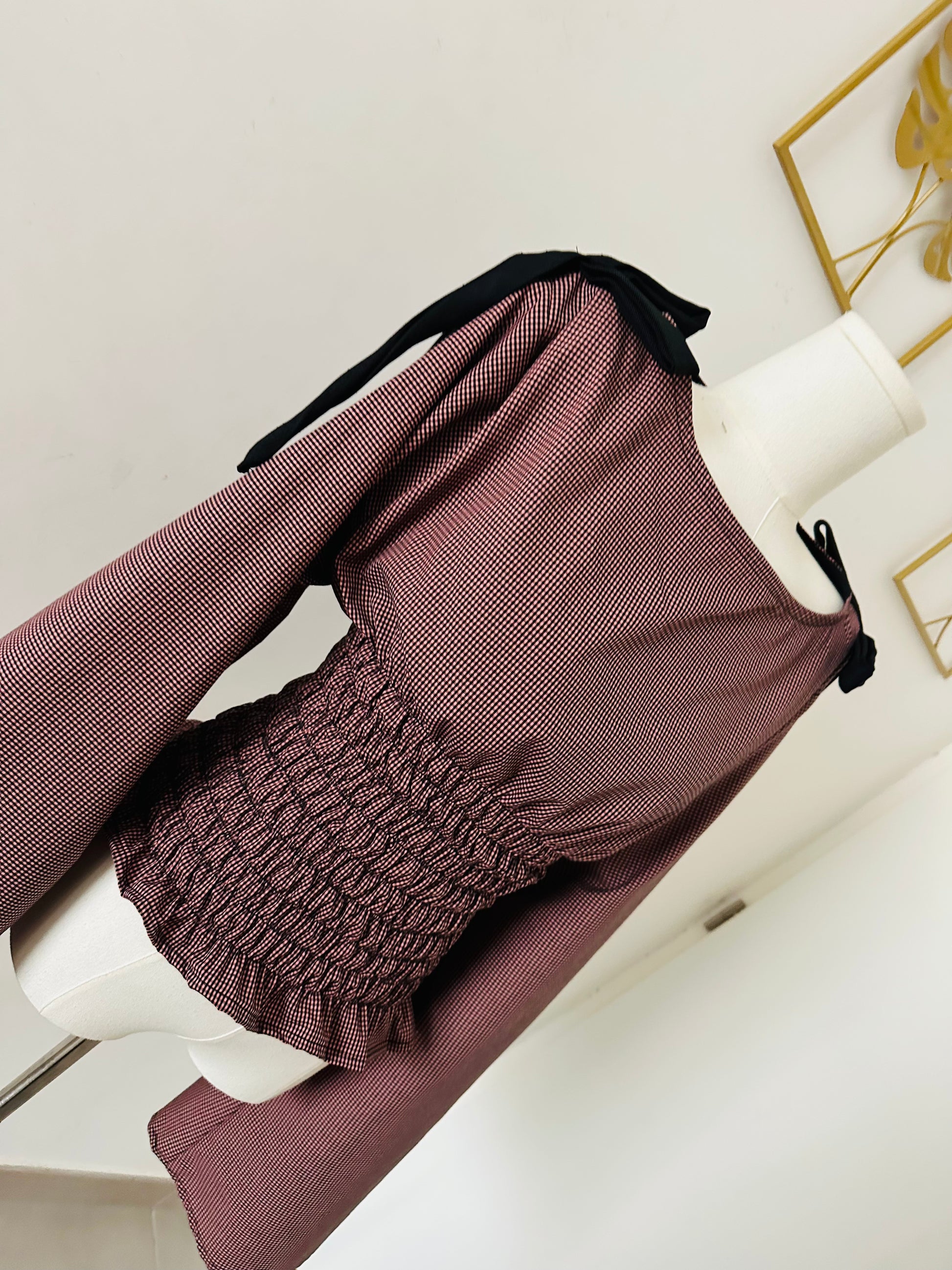 Avec son col bateau dégagé, ses manches longues et amples, et ses nœuds élégants sur les épaules, il apporte une allure chic et naturelle à toutes les silhouettes.