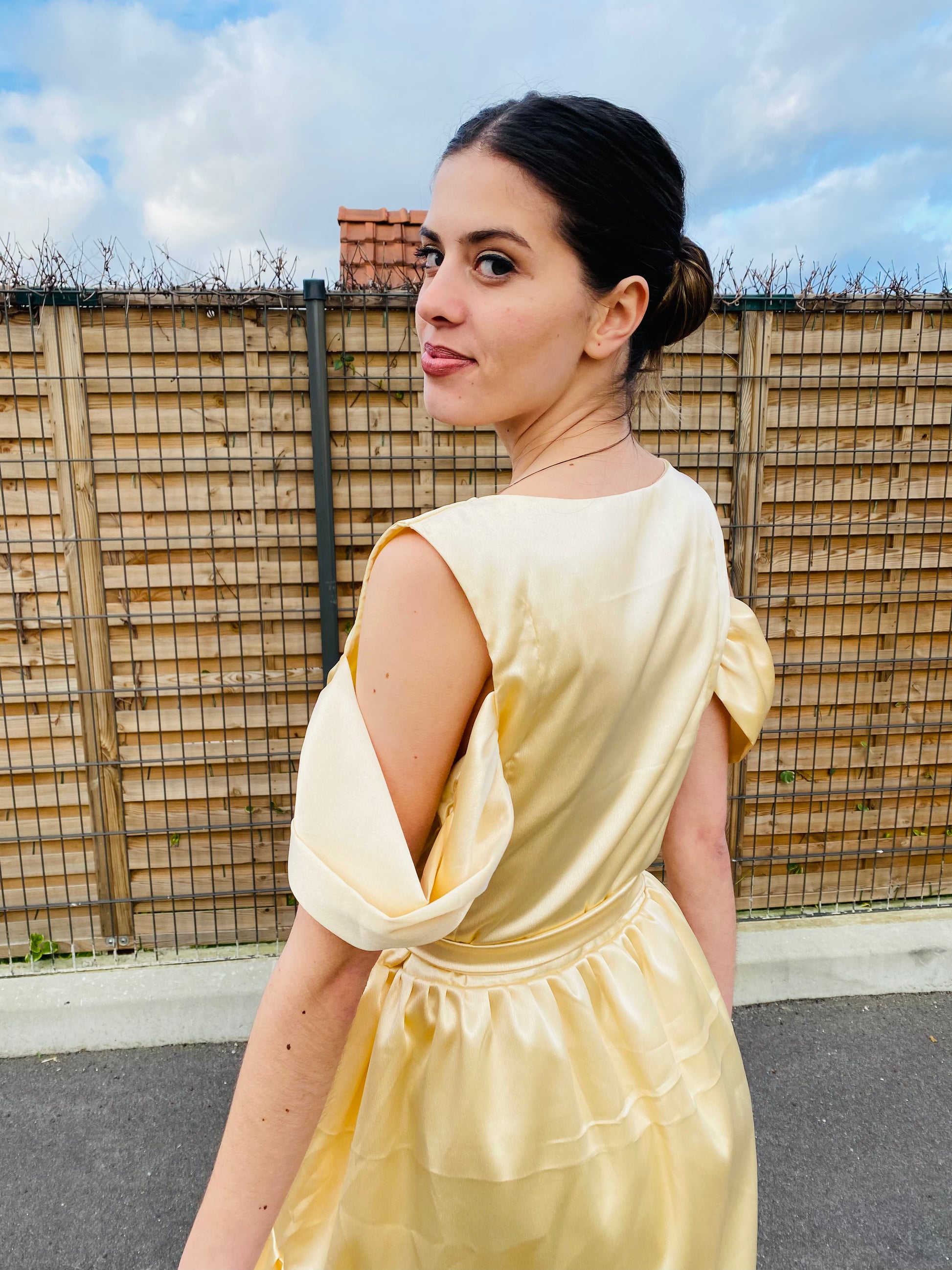 La robe demoiselle champagne et style cache-cœur, Une couleur éclatante sur un satin de Paris de haute qualité un style unique, une robe de demoiselles d’honneur fluide et soyeux.